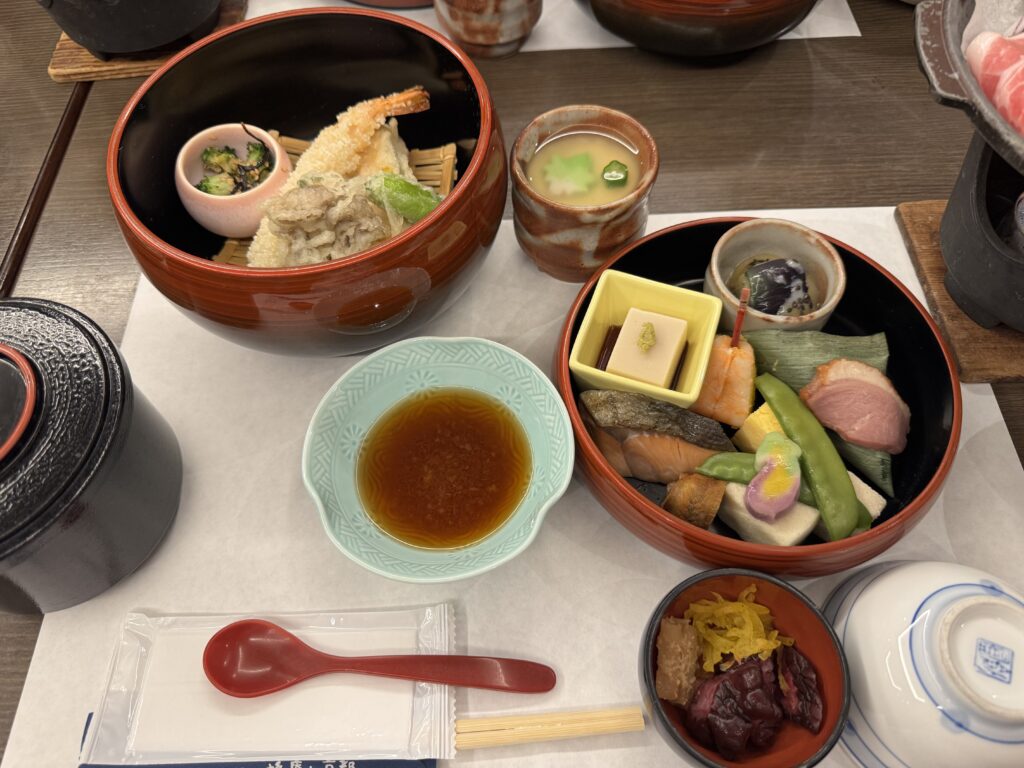 その後バス🚌で八ツ橋庵と刺繍の館に着いて17:00まで時間を潰して夕ご飯を食べた。量が多すぎるので食べきれなかった。