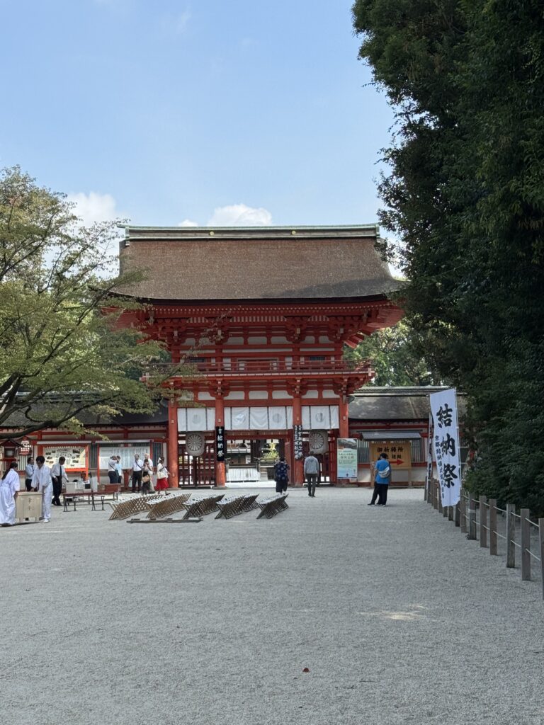 次は上賀茂神社⛩️↓で神職様が神社の由来を神話から丁寧に話してくれました。明日の重陽の日の烏相撲?の神事の準備をしてました。