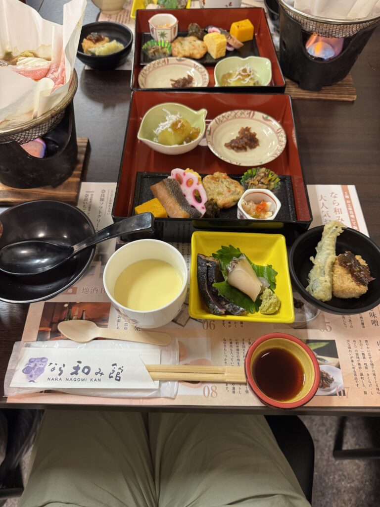 その後夕食の会場までバスで移動して夕ご飯はなら和み館で食べてお土産買ってホテルに戻る。ホテルに荷物を置いて奈良駅まで散策した。奈良駅までは近くて綺麗でスーパーで飲み物買って明日に備える。モスで買って帰ってホテルでバーガーやナゲットを食べて寝る。