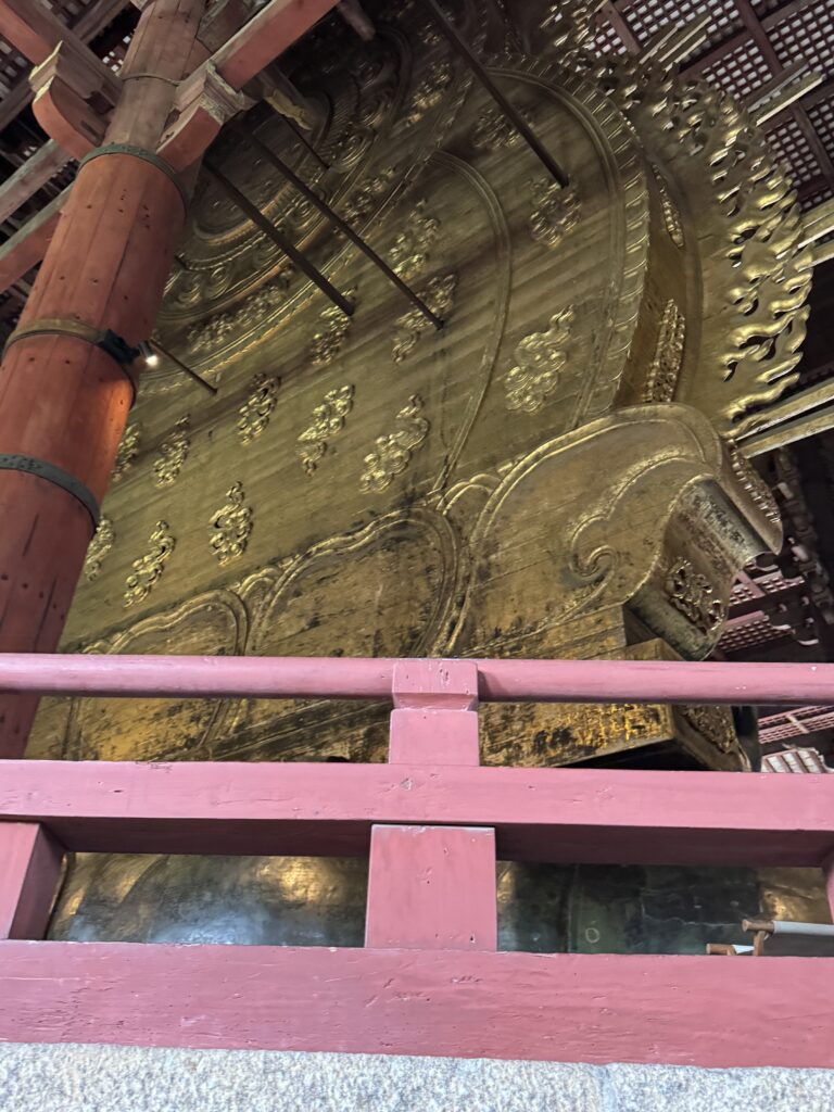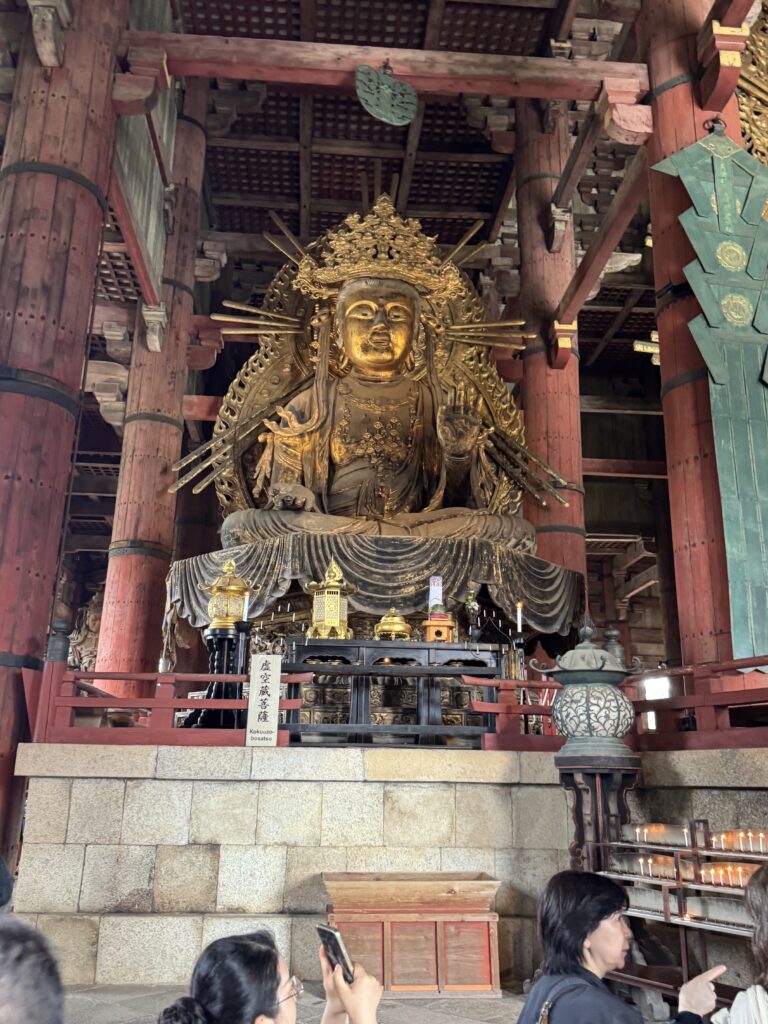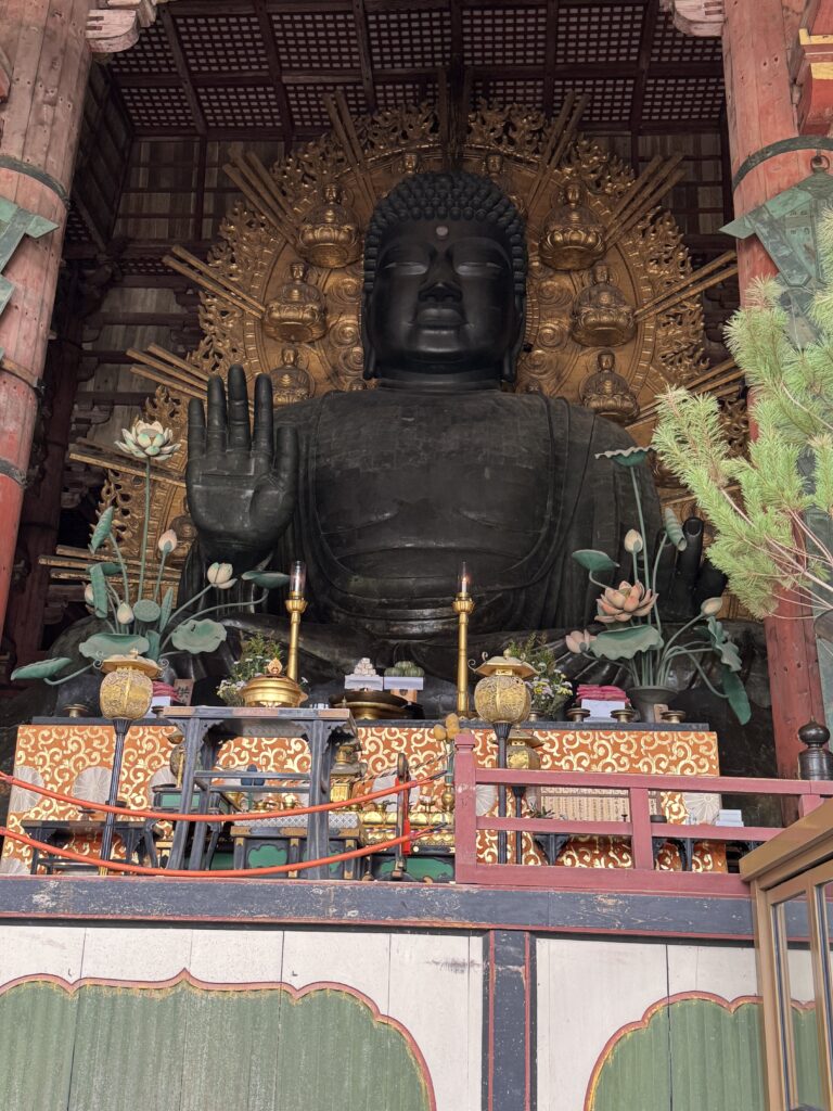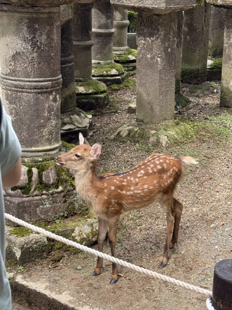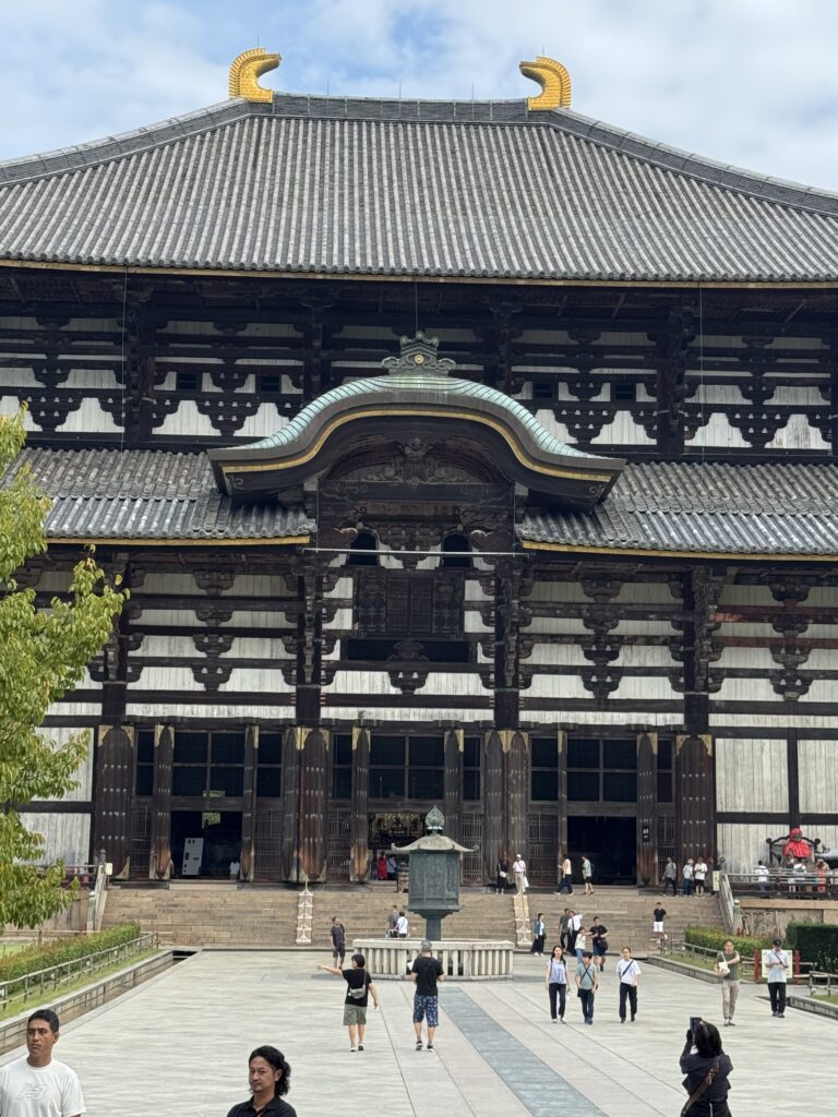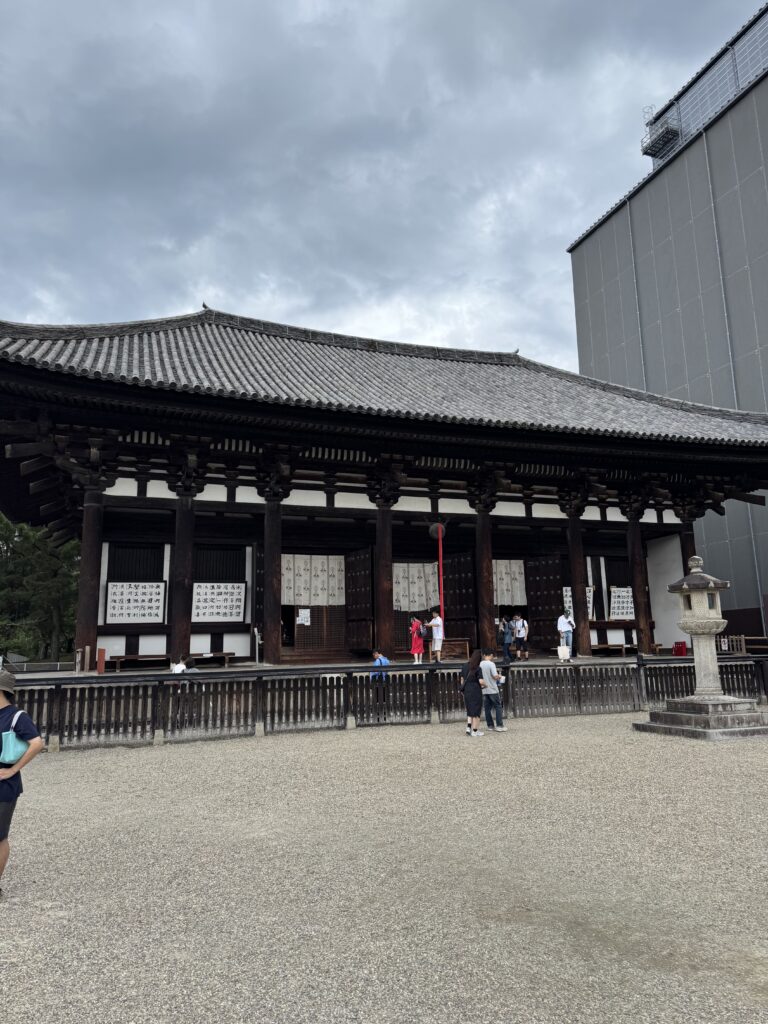 朝はちゃんと5:00過ぎに起きられた。夜更かしして体力的に心配だけど早朝6:30から朝ごはんが和定食ですっごくうれしかった。ブッフェもいいけど和定食ってわざわざ取りに行く手間がないからゆっくり食事が出来て、しかもお魚がメインだからうれしい。朝は7:50集合でバス🚌で奈良公園ヘ。鹿🦌さんがたくさんいて可愛いのでテンション上がる。まずは東大寺へ。真っ先に向かうと空いてて写真も撮り放題で広くて大きくて超良かった。東大寺の次に二月堂と三月堂に行って東大寺と二月堂で御朱印ももらった。三百円の手書きでびっくりした。集合場所に行ったけど時間に余裕があったので鹿🦌煎餅を買ったらあっという間に食べられて近くのソフトクリーム🍦屋さんが350円と安かったので皆で食べた。その後も南大門に隣接する東大寺ミュージアムで涼んで次の春日大社まで徒歩15分で皆で行く。