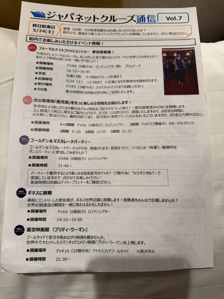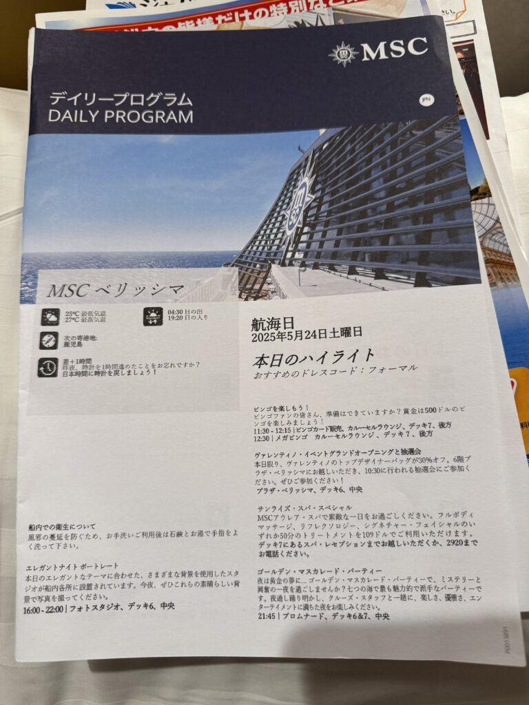 今朝はパパさんが早起きして身支度するので慌てて私も起きてレストラン🍽️にモーニングを食べに行く。私の時計は台湾🇹🇼時間で船内の日本時間と1時間のズレがあってラジオ体操もパパさんがいたからやっと参加出来てうれしかった。ラジオ体操の参加者が多過ぎて体操後のブッフェやレストランの混雑はハンパないから体操前の朝食のフレンチトーストが美味しくてブッフェになくて感動もの。お部屋に戻るとお掃除が未だだったのでブッフェでくつろぐ。ちょうどタイミングよく窓側の席が空いたからラッキーだった。今日は雨天で波が高くてものすごい勢いで揺れまっくって疲れもあって午前中に寄港地の鹿児島とヨーロッパの説明会に連続して参加してランチを知り合いのご夫妻と大阪の親子?とご一緒した後お昼寝😴。揺れるからものすごく眠気🥱に襲われたのかな?夕方のライブはギリギリ過ぎて満席で入れず部屋で中継を見たらすごくラクだった😊ディナー🍽️はみんな欠席で私とパパさんの2人だけだからメインも二つ欲張ったけどお肉料理は駄目で残してしまった😅やはり魚料理をメインで選んで正解だった。サービスのロブスターのパスタも美味しかった。コースのエビのビスクやポルチーニ茸のリゾットが特に美味しかった。コックさん達やフロアマネージャーの乾杯の歌🎤と挨拶があった。食後に再びロンドンシアターのLIVEを観に行った。テレビとは違って見応えがあった。その後ブッフェでコーヒー飲んで一休みして明日のドリンクを調達した。寝るまでずっと船の揺れがひどかった。時計も台湾時間のままで携帯も時差が解消されなかった。